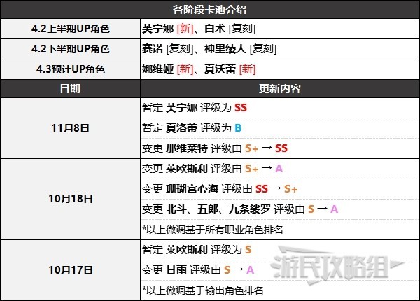 该排行同时考虑了与当前环境最强类型的角色的兼容性,以及是否具有最合适的装备等因素。因此某些角色的评级会高于单项表现,或某些角色的评级会低于当前表现的水平。