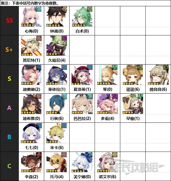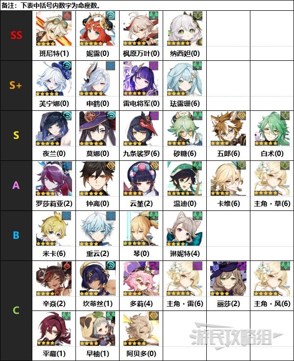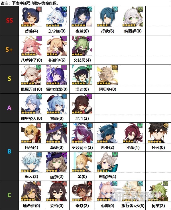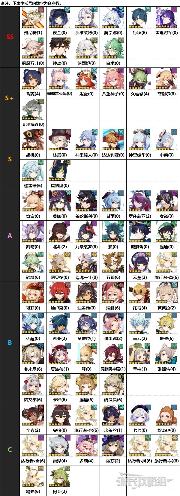 ※下方角色名后括号内数字为命座数,角色排名可能会受其他因素影响。