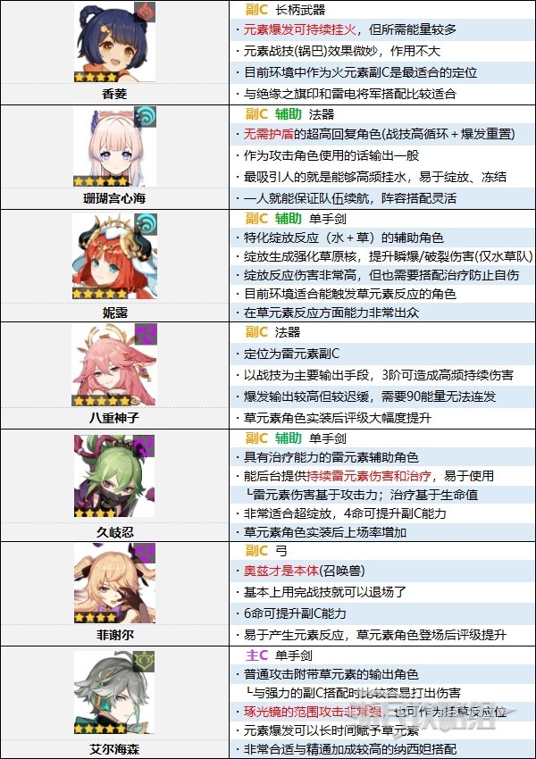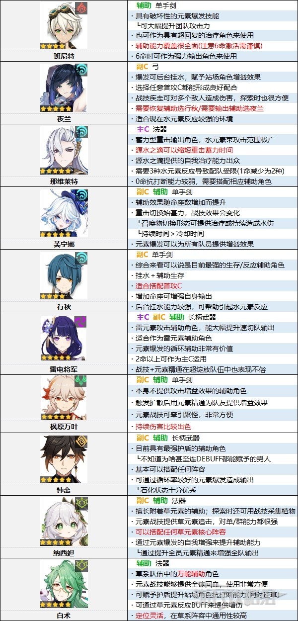 ※风元素角色的评价由于圣遗物【翠绿之影】四件套的减益效果多数都会上榜,其中具有特殊减益能力的角色评级较高。