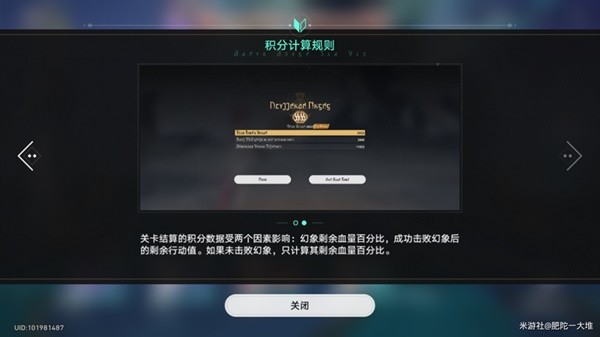 关卡设置的有行动值计时器,我方角色和敌方目标行动时扣除对应的行动值。在关卡结算时根据幻象剩余的血量百分比或击败幻象后剩余的行动值来进行积分计算,并给予相应的评级。