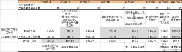 攻攻风攻、攻攻攻攻、攻速风攻、命攻风攻的伤害都还不错;而中间几组由于浪费的副词条太多,没法有效转换成大攻击,所以伤害期望会明显降低。