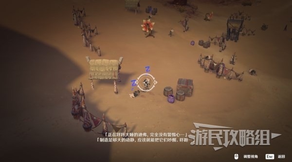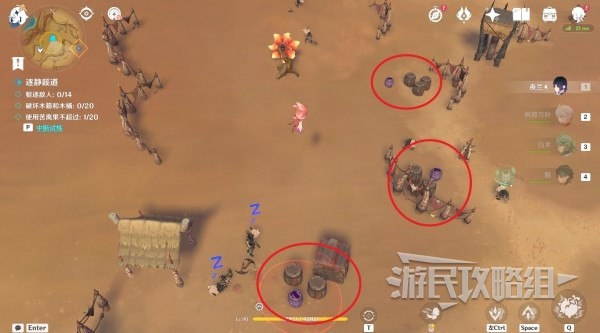 睡觉的丘丘人只要将斯露莎移动到附近的爆炸桶上方,按Q投放苦离果即可驱逐。顺便将旁边的第三个爆炸桶也炸掉。