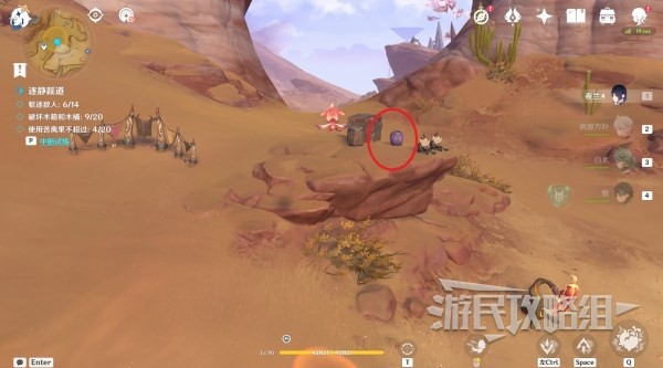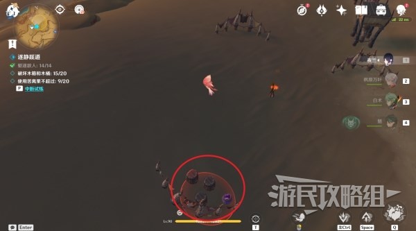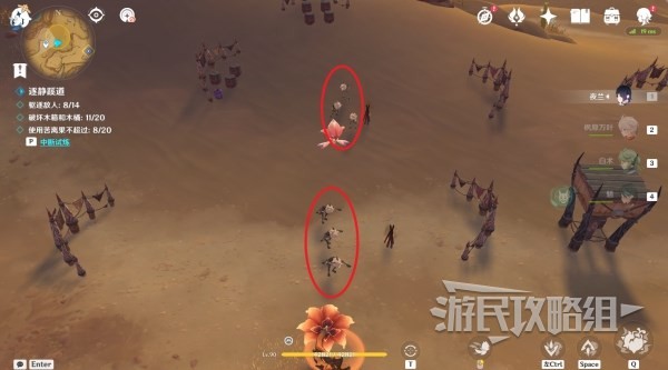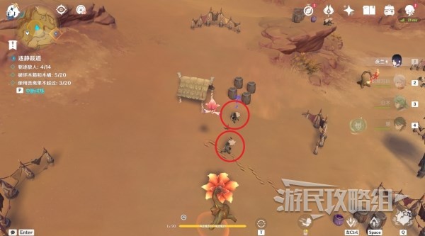附近生气花团前方有一只睡觉丘丘人,还有一只巡逻丘丘人,当两只丘丘人在花团前方一条线上时,对花团投放苦离果将这两只驱逐(算好提前量)。