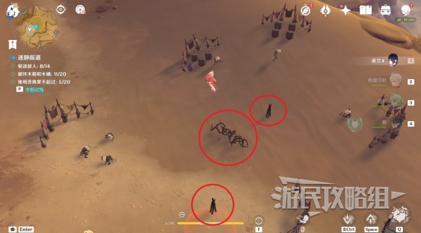 附近6个丘丘人被篝火吸引过来开始跳舞后,对旁边的花团投放苦离果,驱逐6只丘丘人。