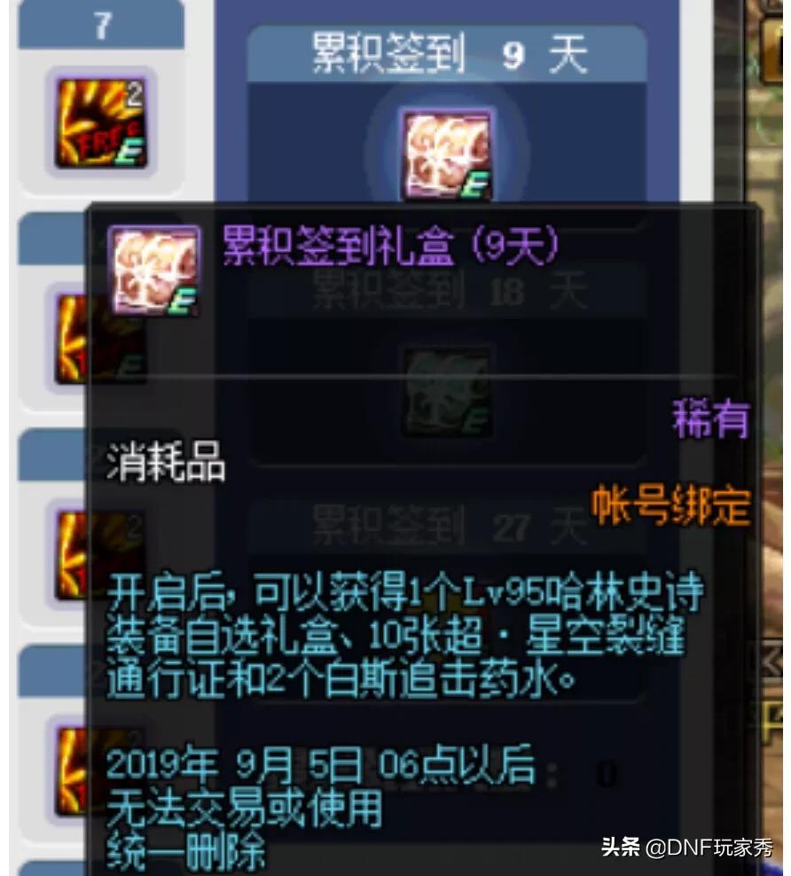 累计9天送一个哈林史诗自选(改版后哈林可升级为泰波尔斯),10张超星空门票和2个白斯追击药水;