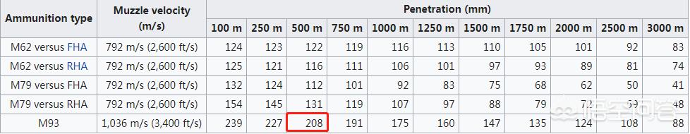 但按照当时76炮使用M93超高速穿甲弹在500米之内穿深如下图,208mm