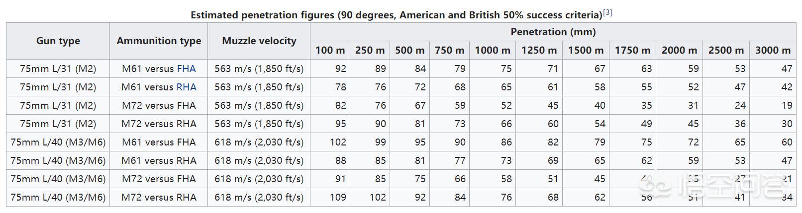 这个镜头能看出除了中间的M3型75MM火炮的谢尔曼之外,另外两辆都是使用M1A1C76MM火炮的谢尔曼,他们的穿深表如下(来源WIKI)