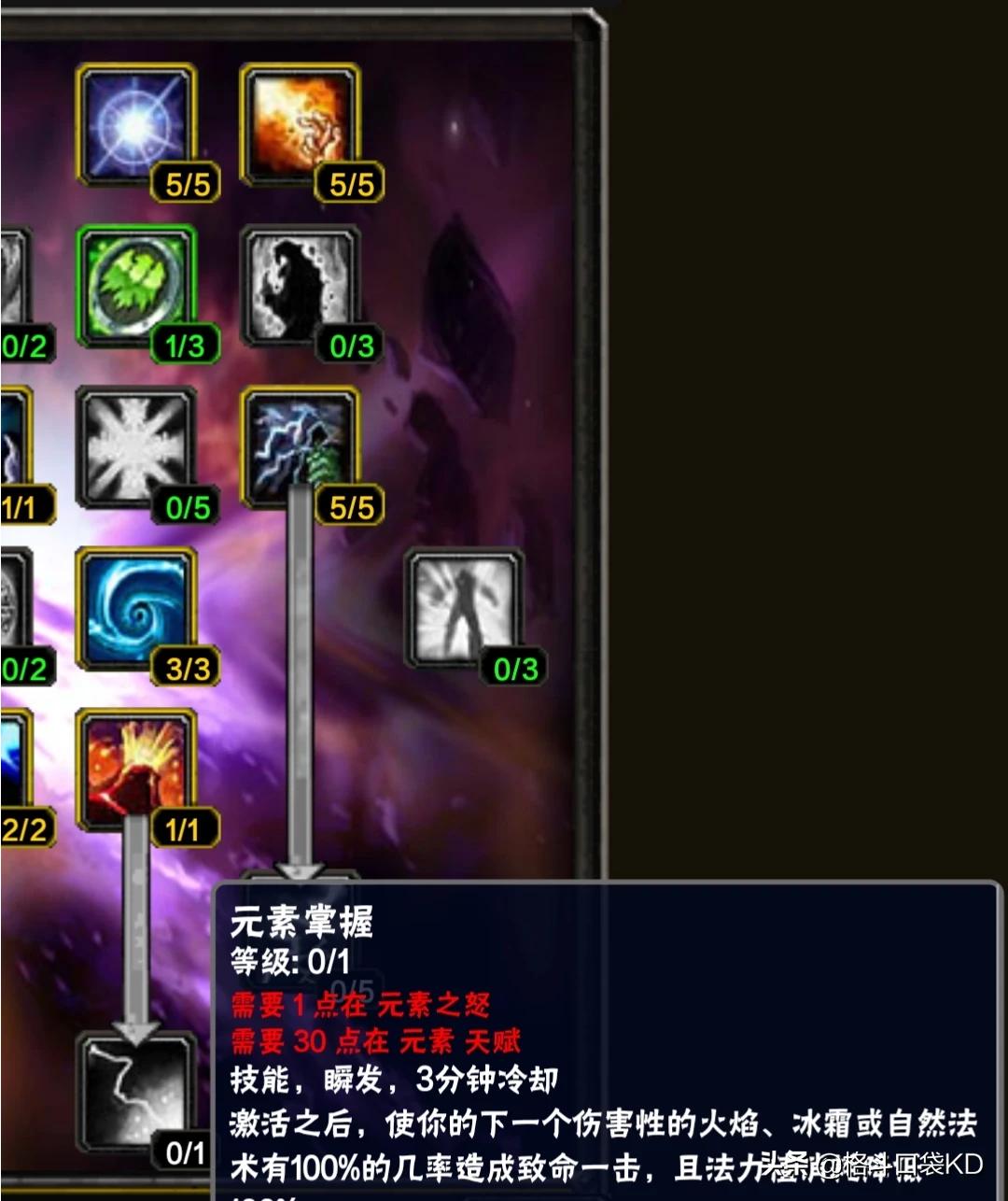 元素掌握,激活之后,使下一个伤害性的火焰、冰霜、或自然法术(闪电箭等)必定暴击,且不耗蓝。进攻性天赋,增加短时间内爆发时使用。如果你想做个战场炮台,那就点它吧!