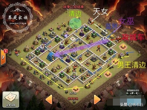 12点方向小龙配合气球清边,防止女王向左走偏,天女顺利向3点方向滑步。另一边,蓝胖和男王清3点区域建筑,而后男王一路向下清理阵的外围建筑。载有巨人的攻程车,开墙进阵,天女咏王、蓝胖及女巫大部队一起随攻城车进阵,喝了狂暴的将士在地震大范围墙震开城墙后,大军势如破竹,一举摧毁敌军阵地。