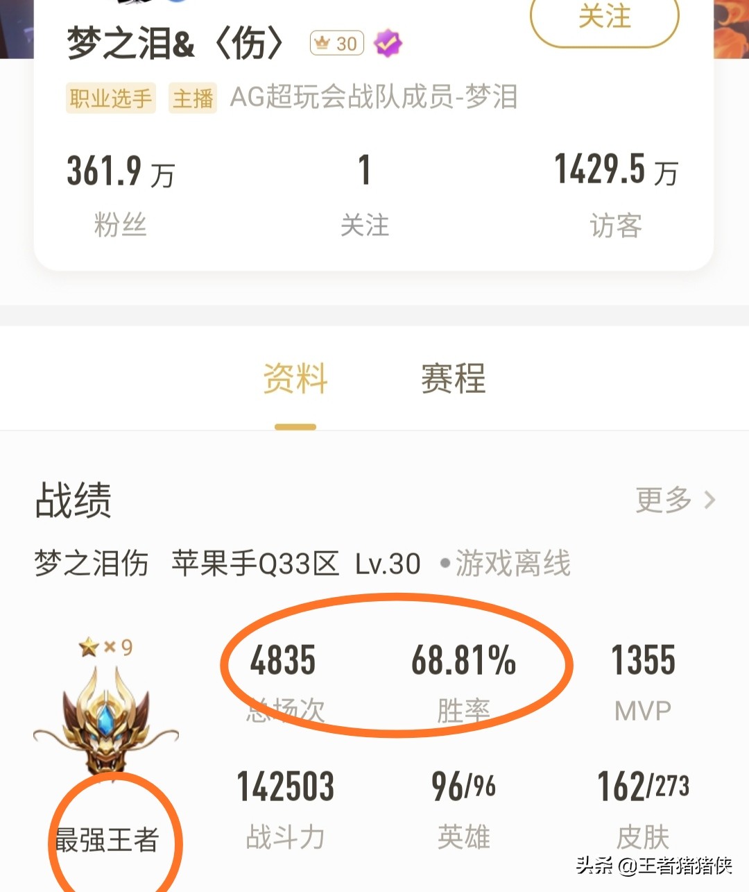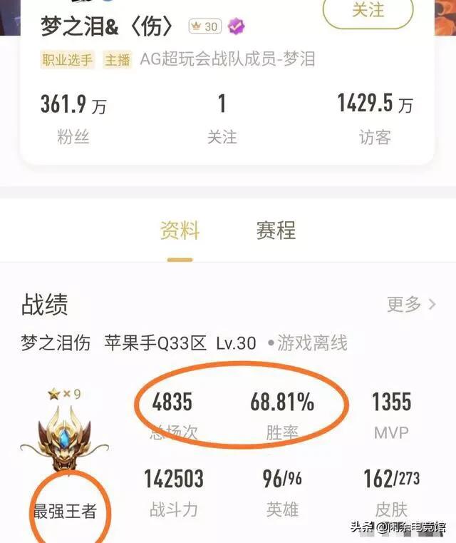 首先我们看到的梦泪选手的账号,从他的段位可以看到,他并不是钻石,而是最强王者*9星。总场次4835场,胜率高达68.81%还是很高的了,要知道王者荣耀平衡机制,基本上玩家的普遍胜率都在50%-60%之间,超过60%就很优秀了。