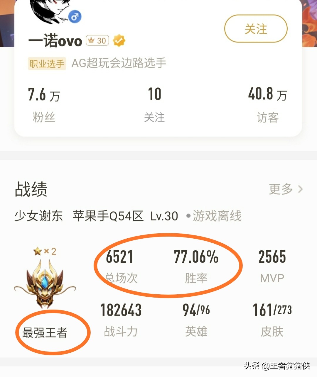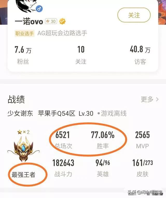 上面这个是一诺的号,段位最强王者,胜率高达77.06%,总场次6521,不愧是人气选手。