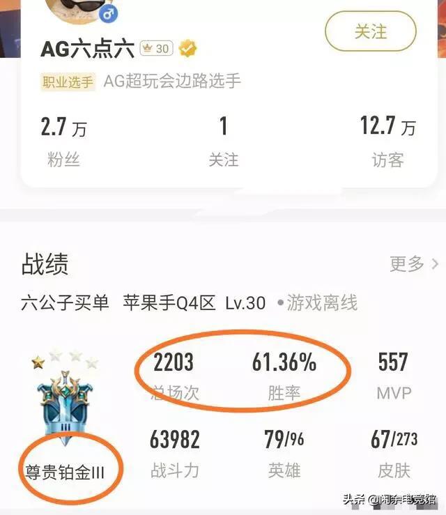 接着我们看到的是六点六选手,他的段位是铂金。6哥先上,6哥开大。6.6这名选手在战队里非常核心的队员了,他的上单还是很强的。不过就是经常容易被队友卖,这样太尴尬了,从他的战绩上我们也能看到,胜率在61.36%,场次2203。看来6.6选手平常可能并不关注自己的号。