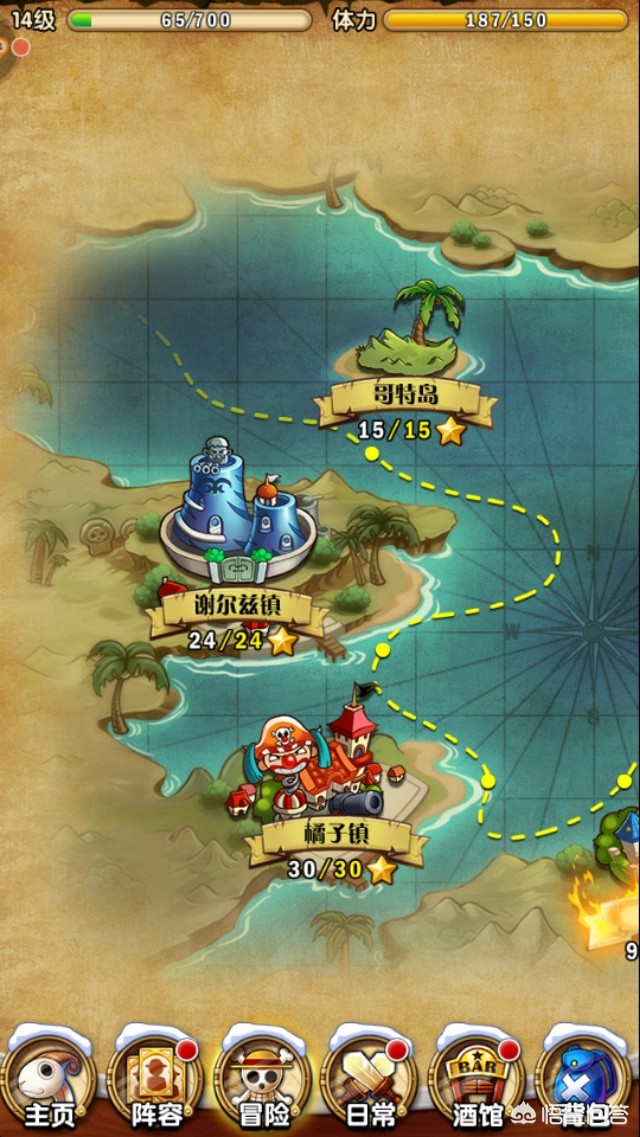3、游戏以航海王路飞为第一视角,其他伙伴获取需要到酒馆招募,分为三个等级。这个估计在各类手游中都有类似设定,进入游戏一看便知。不过值得一提的是卡片人物设计的非常绚丽而又终于原著形象。反正我是刚开始抽到了奈美和撒谎布,一下子就喜欢上了,嘿嘿。