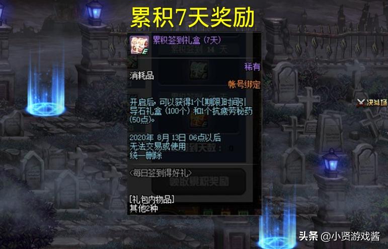 累积14天可以获得100个时间引导石和2个100级传说装备自选礼盒,100级传说装备自选礼盒适合小号,或者打算增幅许多100级装备继承到100级史诗的玩家,不过想必大部分玩家都不会做吧。