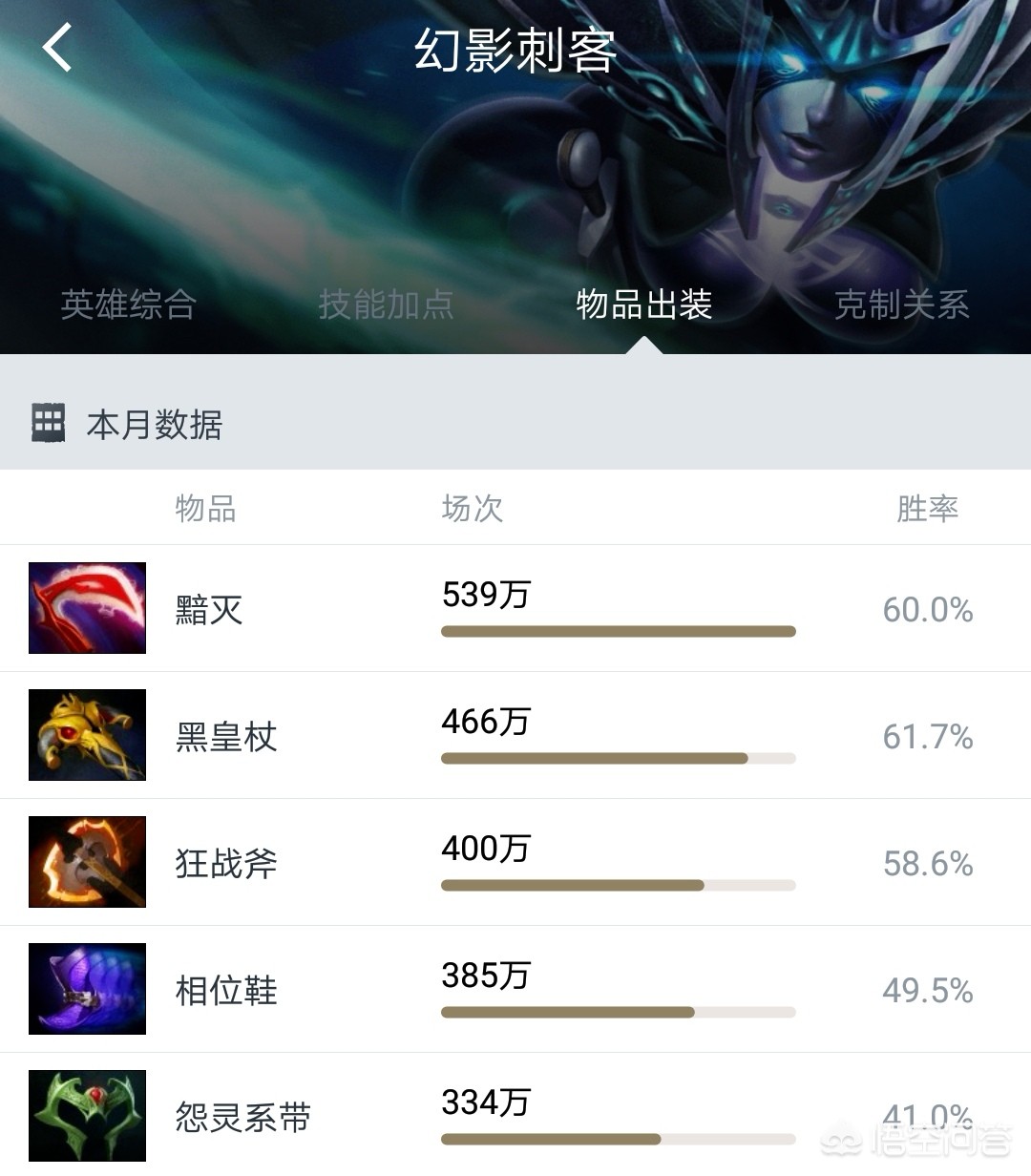 首先来看看幻影刺客近一个月出装榜,暗灭居首位,很明显在7.20快节奏下,中期拥有暗灭的幻影刺客可以说伤害爆炸,很多英雄都不如她的爆发来得快!