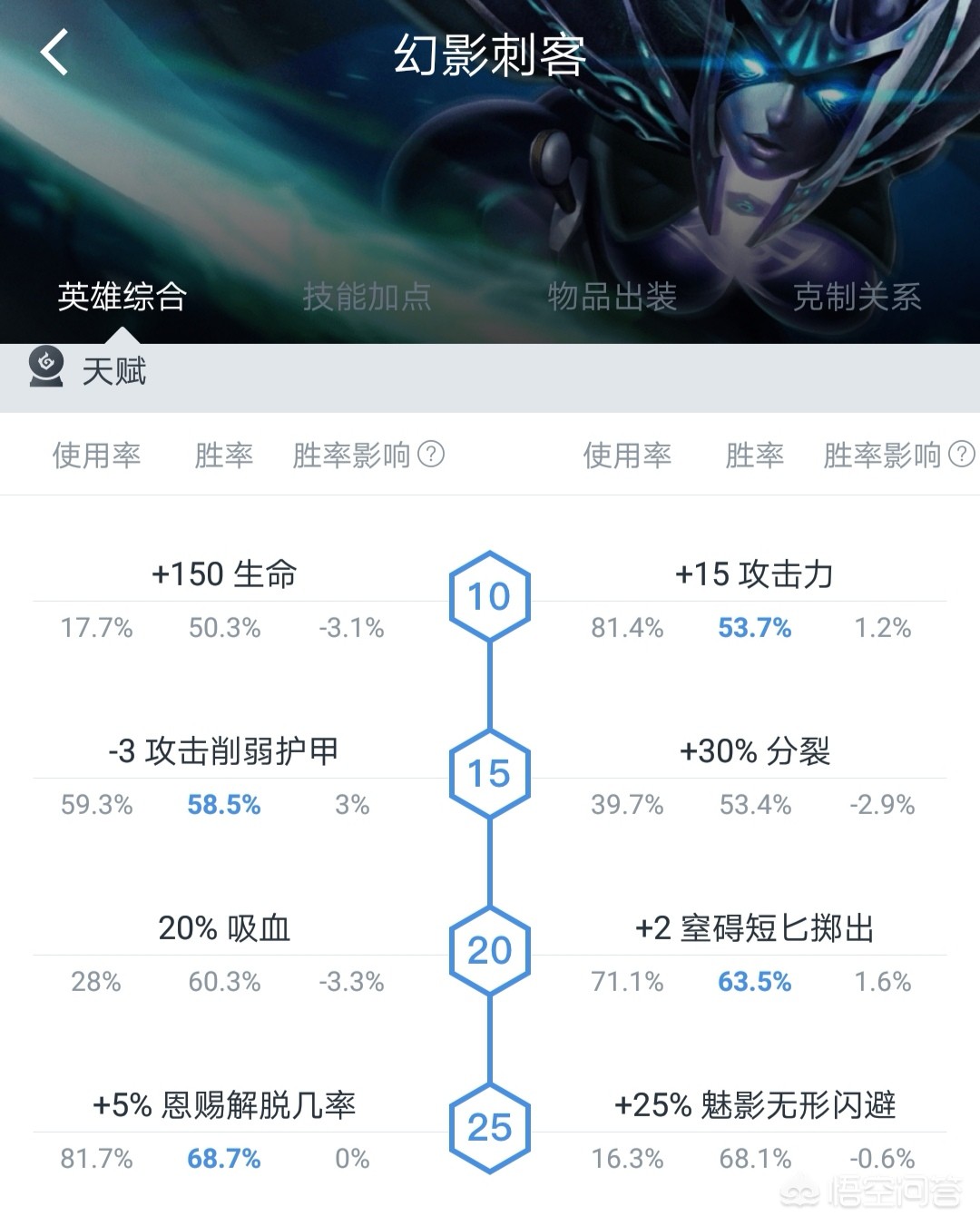 再来看看幻影刺客天赋选择。攻击力+削甲的路线使用率更高!