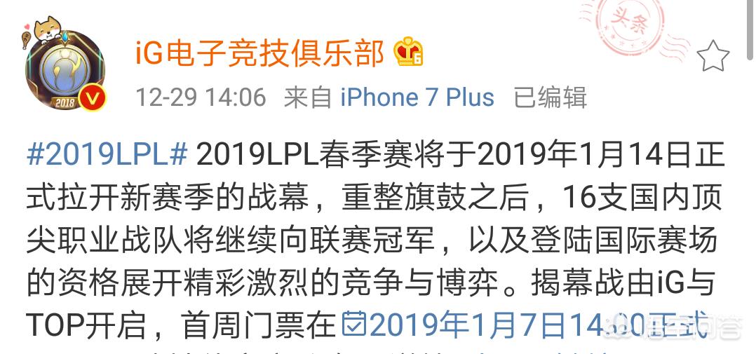 最近,关于LPL2019年春季赛赛制改动的消息是一个接着一个传来,首先是前天官方在没抽签之前就公布了揭幕战是由IG对阵TOP,然后是苏宁19年春季赛的赛程表是直接可以说明在明年春季赛LPL赛制将有所改变。