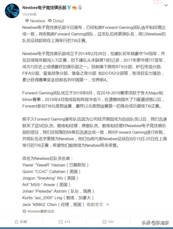 在7月25日,距离TI9只有20的今天,Newbee战队官方宣布收购Forward Gaming战队,此战队原班人马以及经理教练将以Newbee队名带队征战TI9。此前,Forward Gaming战队由于队内财政问题不得已宣告俱乐部解散,而这只战队也在此前挤进了TI9的队伍名单,所以这支队伍一直在寻求一个新的赞助商,而令人没想到的是,这支队伍选择了国内的赞助商。