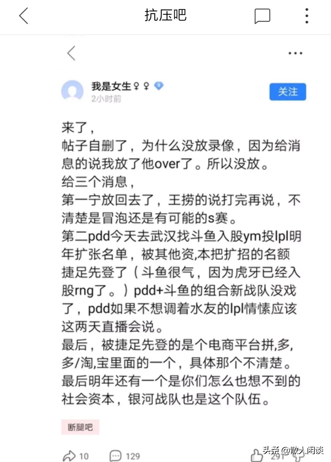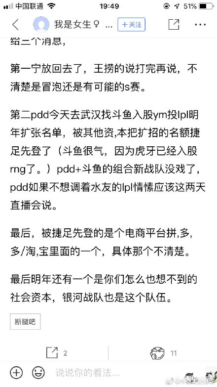 熟悉直播圈和英雄联盟圈的小伙伴们应该都知道,企鹅电竞的主播葫芦岛吴奇隆“小智”,经常喜欢爆料一下电竞圈的内部消息。这一次关于PDD去竞标LPL席位的事情,小智也是点评了一次内容大意就是“PDD投标不成功,不是因为他的梦想,也不是因为他的口才,只是因为他穷,他没钱。LPL动辄大几千万的保证金,不是谁都能承受的了的”。关于小智的点评,囧王者是绝对同意的,如果PDD身后没有站着一个绝对重量级的资本的话,凭他个人,凭他的人脉和经验,是拿不到LPL资格的。就保证金一栏,就是一个拦路虎。至于网络上说的什么拼。多。多和淘。宝即将进入英雄联盟圈子的事情,囧王者在昨天的文章里面已经讲的很清楚了,坐等吃瓜就好了。