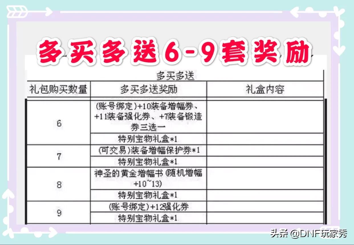 (二)当购买6-9套的时候,将获得和2019年多买多送类似的奖励,10增幅券,12强化券,增幅保护券。