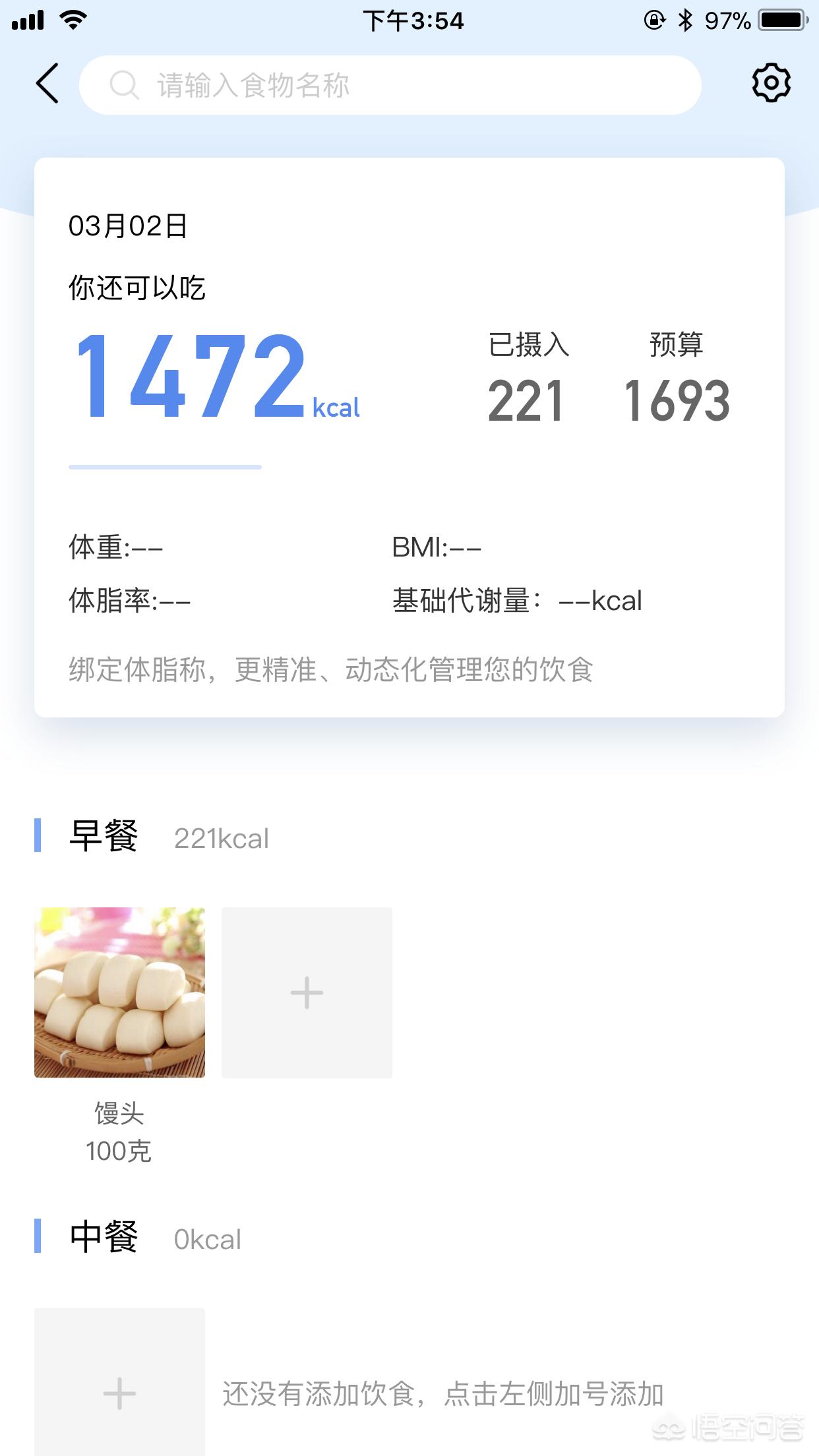 然后另外一个比较有特色的功能就是一日三餐,每天怎么吃有预算(绑定体脂称的情况下)然后每天按照APP推荐的卡路里合理搭配自己的摄入,当然下面还有个性化饮食建议可以参考,这个是我今天吃的东西