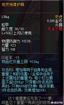 地灵绝魂是DNF运营11年来,最具特色的防具之一,不同于其他史诗自身有强大的属性,地灵绝魂是依靠自身和仓库重量来打伤害的,仓库和自身的重量越高,越能发挥这套防具的效果。