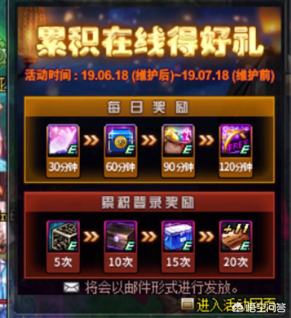 6.18日—7.18日,每天在线2小时,累计20天可以拿完奖励;其中,每日120分钟是超星空通行证1张,累计15天是3个+18的属强首饰宝珠,累计20天,获得终极奖励,+11的武器强化券,武器没有上11的有福了。