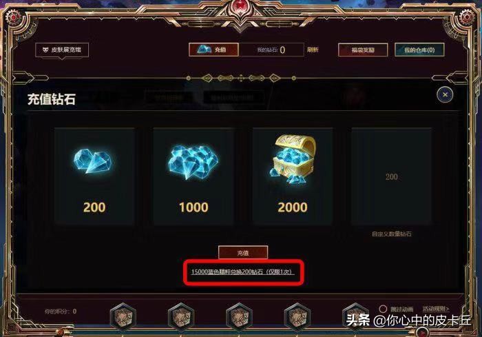这个活动的入口是在充值区,因为是使用精粹进行抽奖的,所以做得较为隐秘,需要点进去才能找到,到了里面我们发现了下方有详细的解释,“15000蓝色精粹兑换200钻石(仅限1次)”,没错,这是官方为了鼓励“零冲党”给予的一项福利,用15000的账号精粹可以获得200钻石,200钻石可以抽好几次奖,运气好的欧皇,限定皮肤是有几率出现的,不过看网友们的评论,有不少抽到了7天限定。