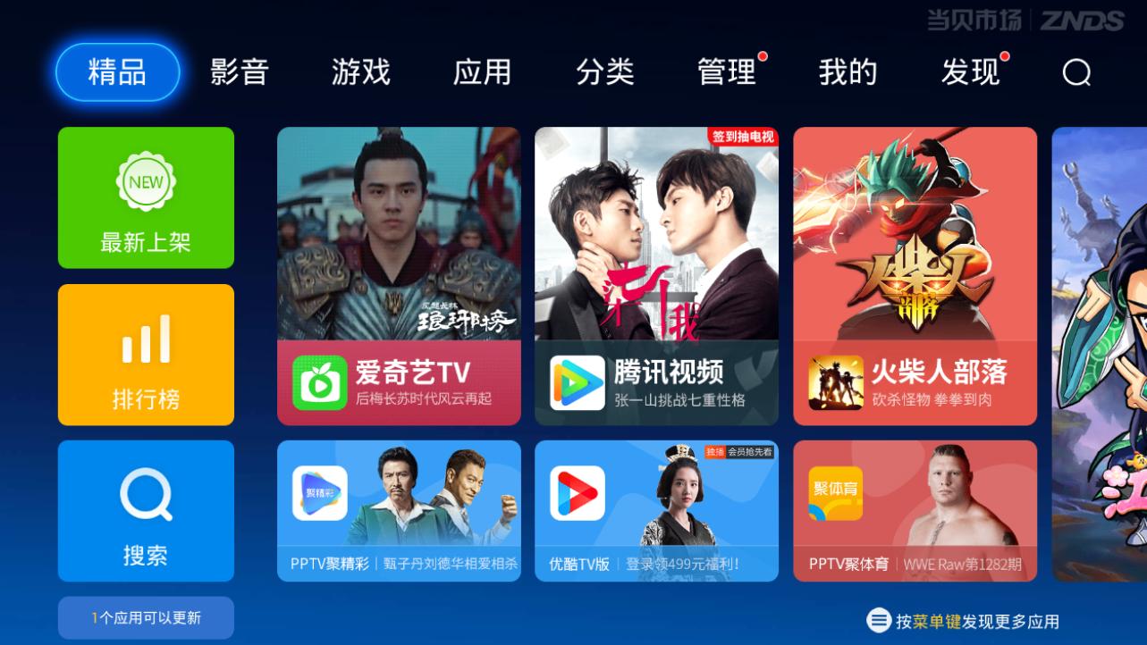 打开智能电视或网络机顶盒上的第三方应用当贝市场。在当贝市场中,所有电视端的软件应用都能免费下载安装。所以直播软件也能在这里安装运行。