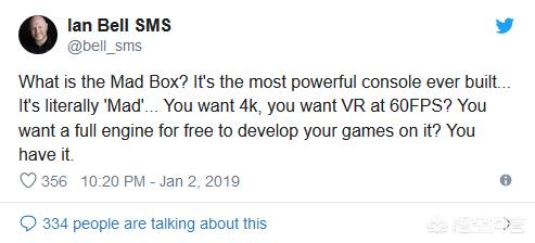 游戏开发商CEO Ian Bell在采访和一系列推文中透露了Mad Box的大致定位,其硬件性能和规格将达到未来2年内运算超快的PC硬件的水准,支持绝大部分的VR头显设备。同时Mad Box的性能支持60帧下运行4K超清游戏和VR内容。还能够允许开发者在其上使用完全免费的开发引擎制作游戏。
