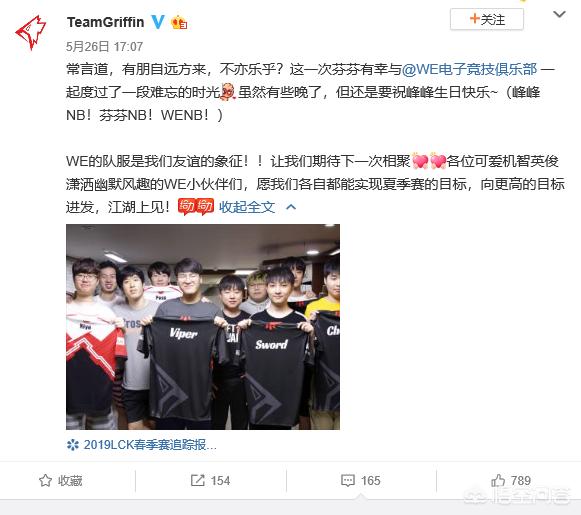 26号WE和GRF训练赛圆满结束,双方互换队服,互相恭维NB一下。记得上次WE训练赛回归是S7春季赛,效果惊人,回来立马把RNG斩下夺得S7春季赛冠军。