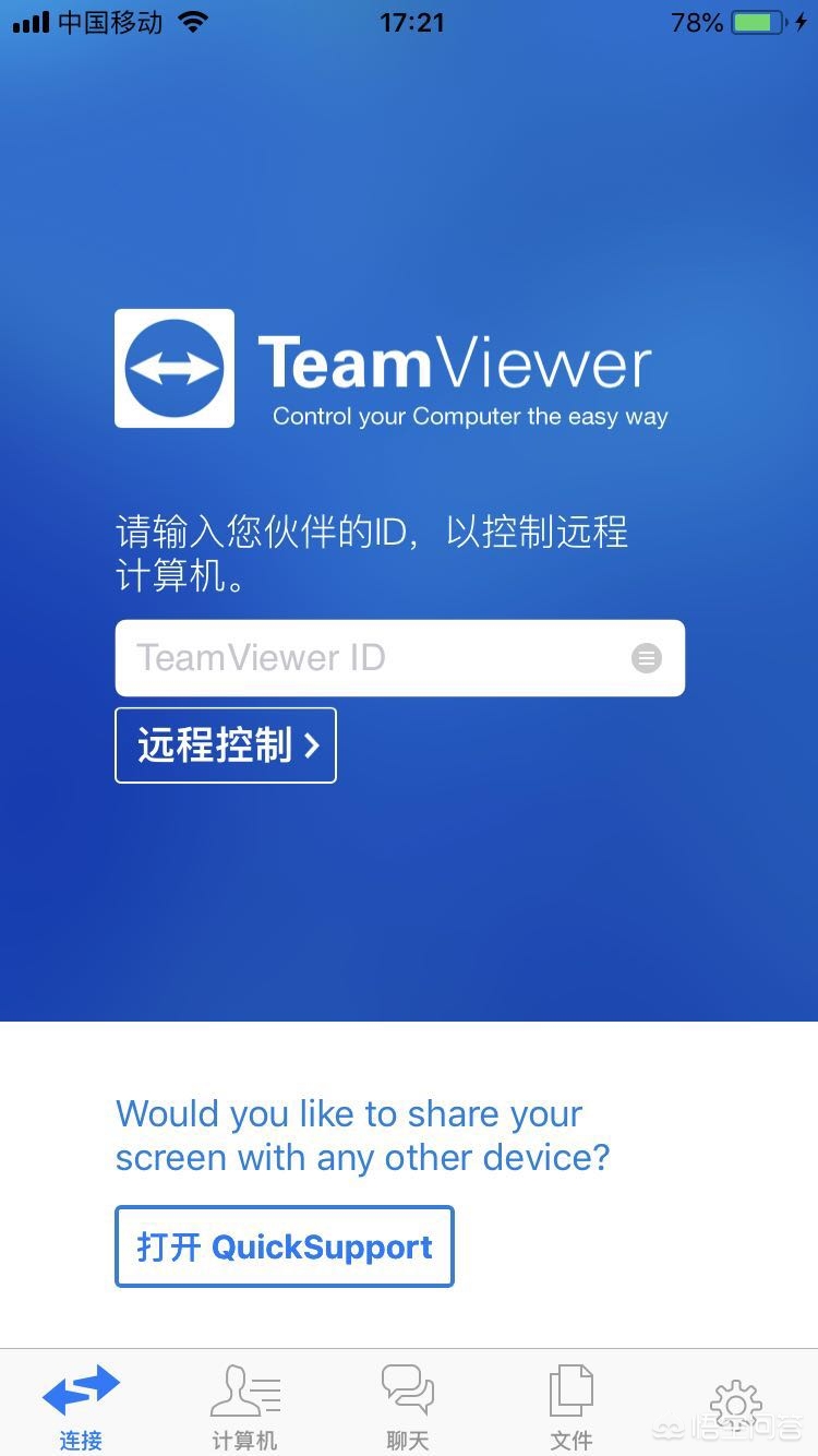 TeamViewer 12此款软件针对个人是免费的。可以通过手机远程控制电脑。只是手机屏幕的原因操作没有这么方便。分别在电脑和手机端装好应用程序,打开手机,输入电脑的ID就可以了。下面以IOS系统配图