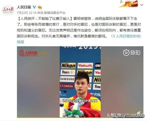 据澳大利亚媒体《the new daily》报道称,在孙杨指责霍顿不尊重中国后,后者终于发声回应,“孙杨不尊重我就算了,但孙杨说我不尊重中国,这样的言论,真是让人遗憾。霍顿啊霍顿,200米不是强项,400输了,800米游不过孙杨,你是来泡澡的?