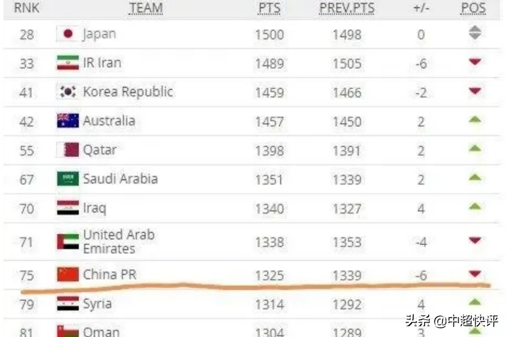昨日,国际足联公布了最新一期的国家队世界排名,中国队排名创今年新低,跌到了世界第75名,亚洲第9名。