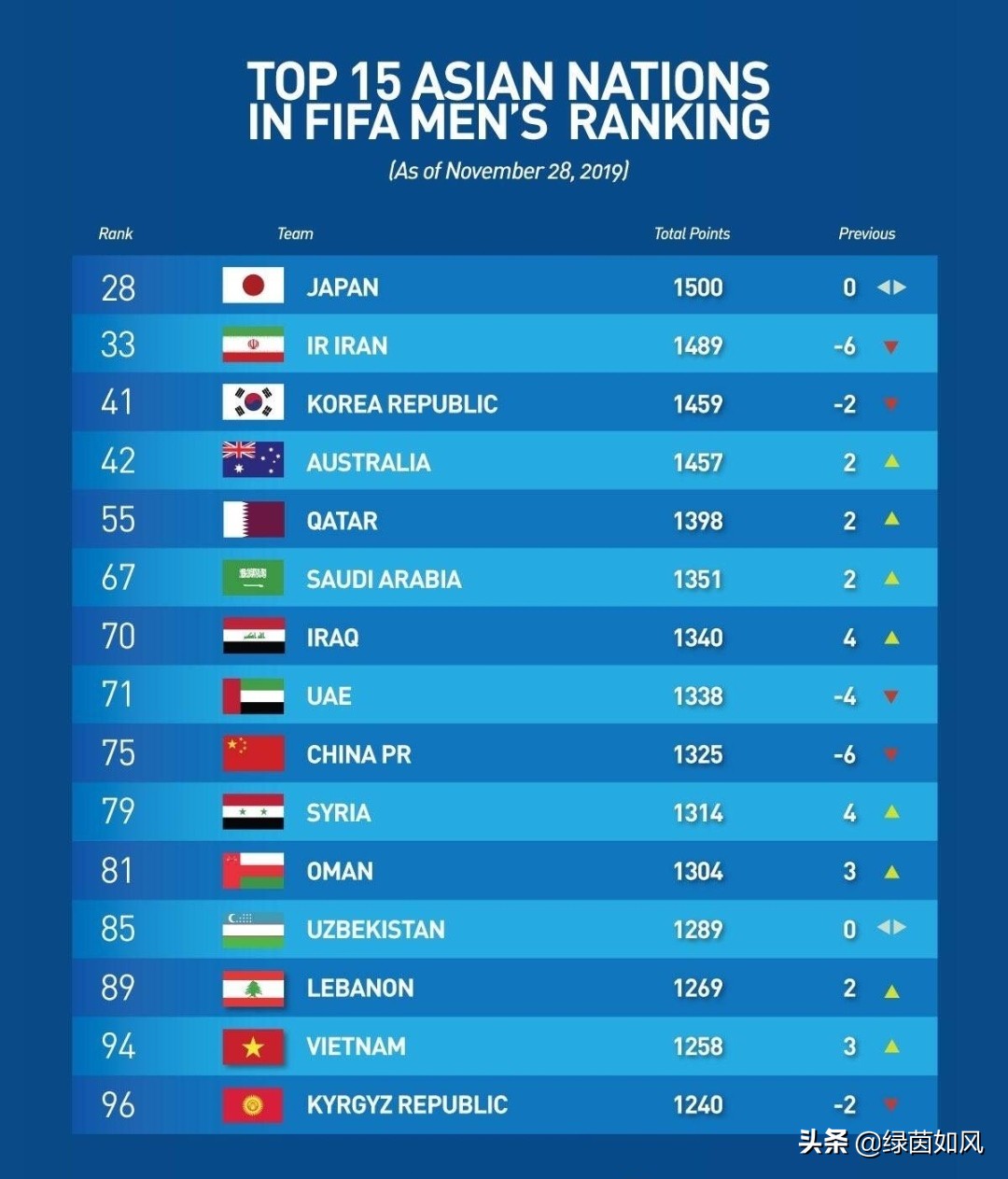 FIFA排名更新:国足排世界第75,亚洲第9,依旧在菲律宾叙利亚前面,你怎么看