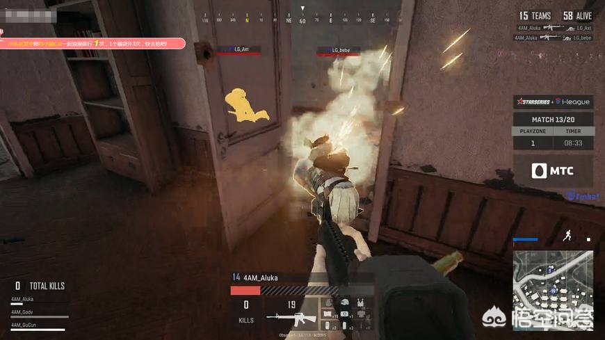 LG战队摸楼遇到了阿鲁卡,LG和4AM真是劲敌啊,一直遇到,LG三人一层一层的搜楼,而阿鲁卡就在三楼,只有阿鲁卡自己,非常危险。