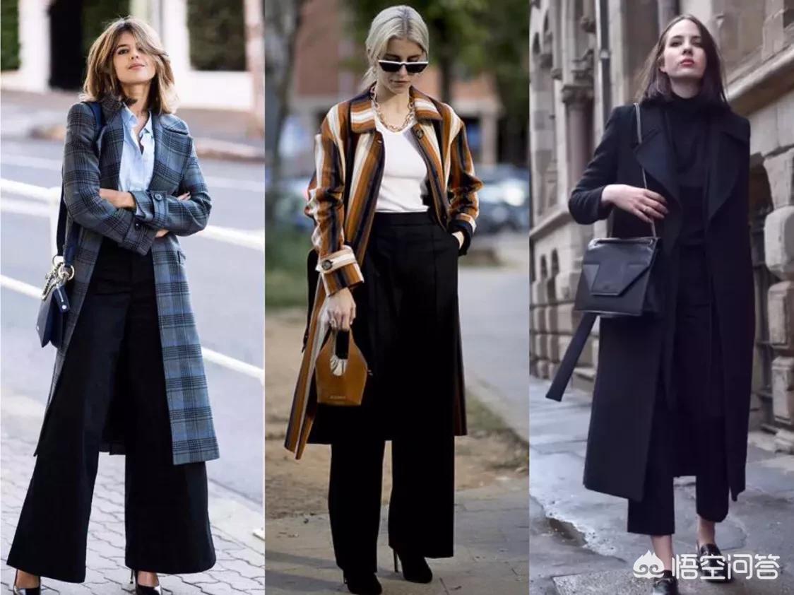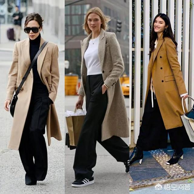 黑色阔腿裤搭配长款大衣,非常简单,又非常显气场的穿搭方式。搭配驼色优雅大气,搭配土黄色,加一双运动鞋,相对比较时髦。
