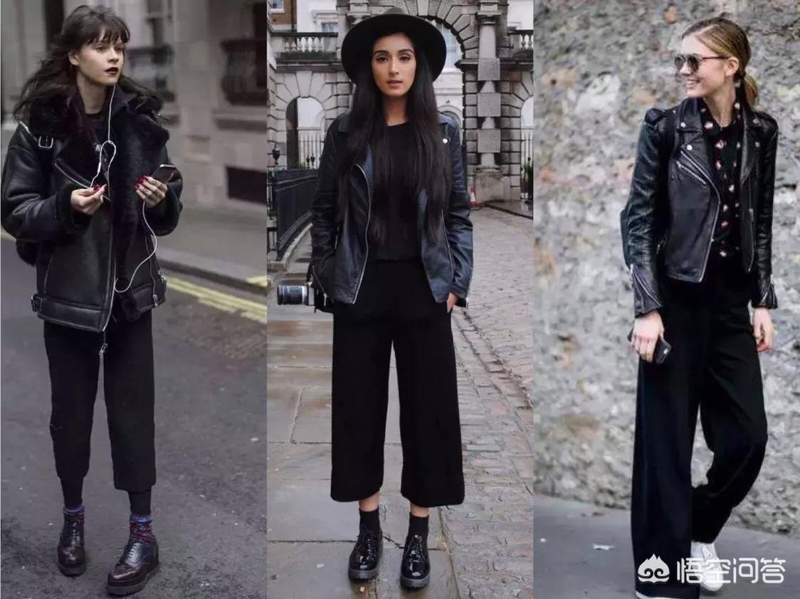 阔腿裤和黑色皮衣能让你秒变酷女孩,觉得一身黑太过单调,可以将内搭换成黑色的印花衬衣,少女感一下就出来啦!
