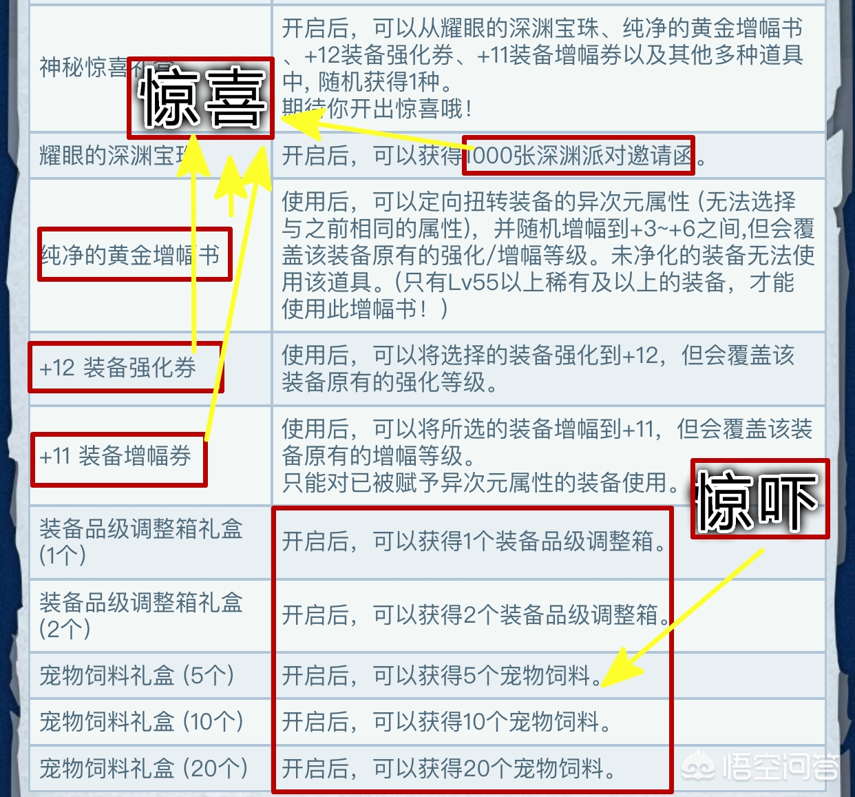 我目前开了4个惊喜礼盒,全是惊吓啊!不过还是感谢策划,正愁宠物要被饿死了,就送我5个宠物饲料,正愁苍穹不是最上级,就送我1个品级调整箱,“感谢”策划啊。