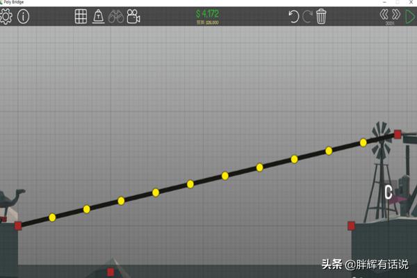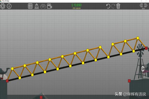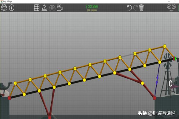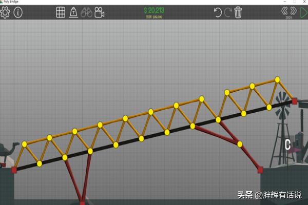 2、像图中所示这样建造一个桥面(桥面的角度是这一关最关键的,应进行多次测试)。