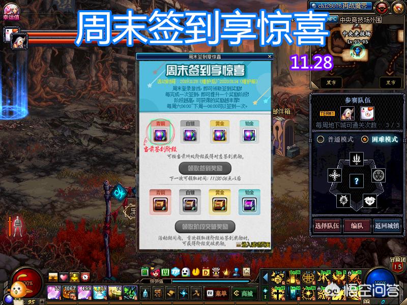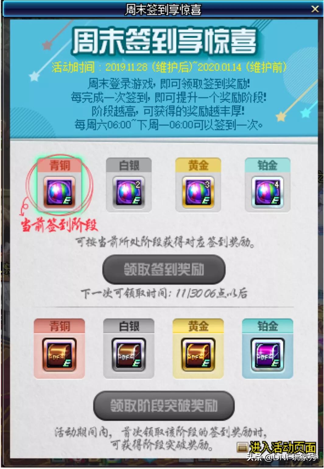 DNF周末签到有惊喜活动又来了,上次签到几率获取12强化券,有一小部分欧皇玩家喜获12强化券,而这次11月28日的新周末签到,签到的方式和上次一样,玩家只需要在“周六早6:00到周一早6:00之间”登陆游戏,点击签到按钮即可,不浪费时间。