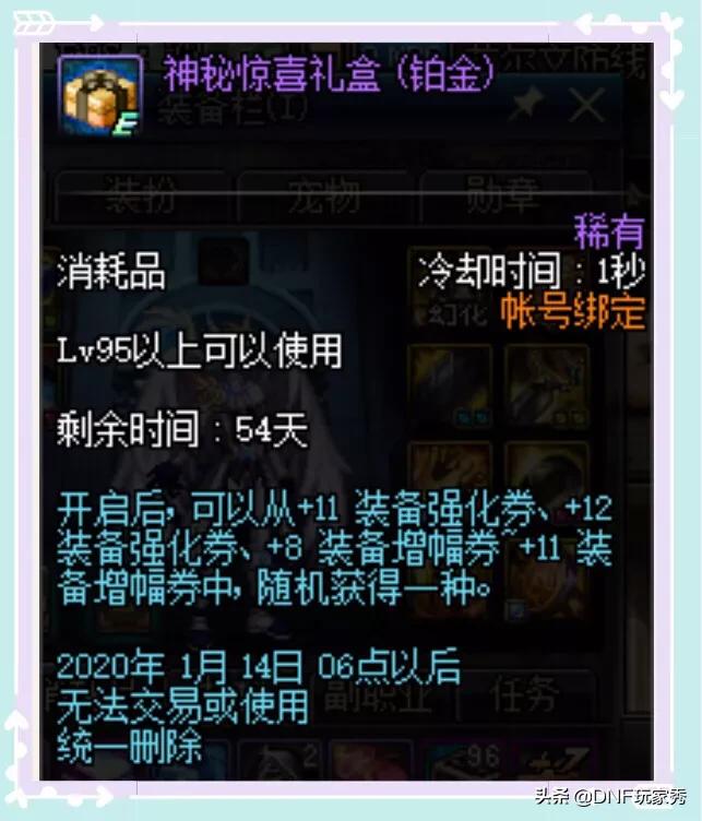 (4)第四周铂金神秘惊喜礼盒,可在“11强化券,12强化券,8增幅券,11增幅券”中随机获取一件,秀儿猜测,大概率为8增幅券/11强化券!