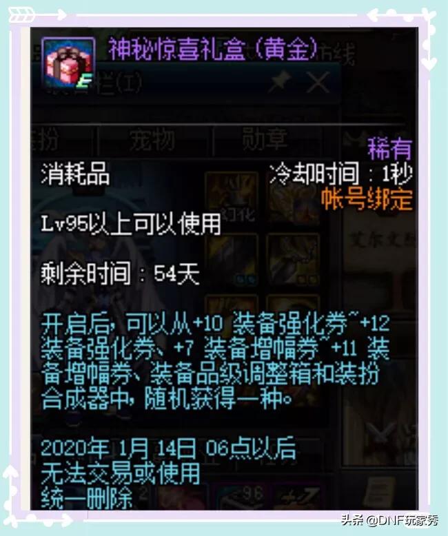 (3)第三周黄金神秘惊喜礼盒,可以在“10强化,12强化,7增幅,11增幅,品级箱,装扮合成器”中随机获取一种,秀儿猜测,大概率为“装扮合成器”。