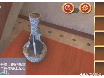 2、拿到雕像以后,先用雕像砸开桌上的花瓶,再将楼梯上左右两边的图拼好。
