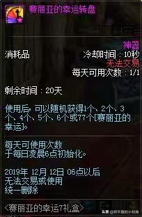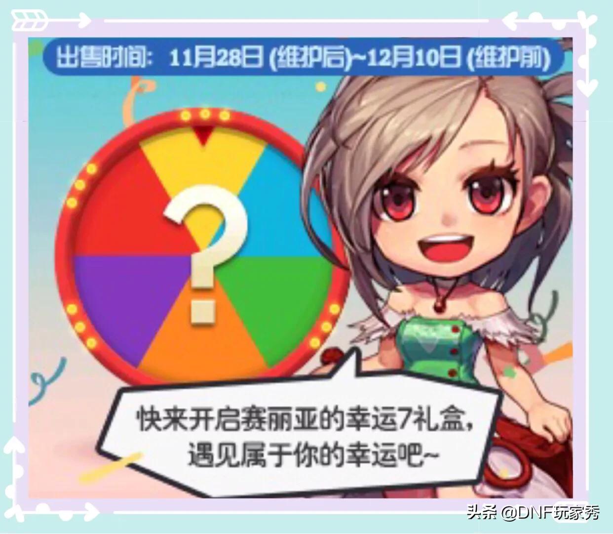 11.28日,DNF的国庆大礼包及一系列的活动将下架,但是,策划的小礼包,依然保持着两周一更新的频率,继“达芙妮礼包”,“大吉礼包”,“普雷礼包”之后,策划又推出了下一个新礼包,“赛丽亚的幸运7”礼包!