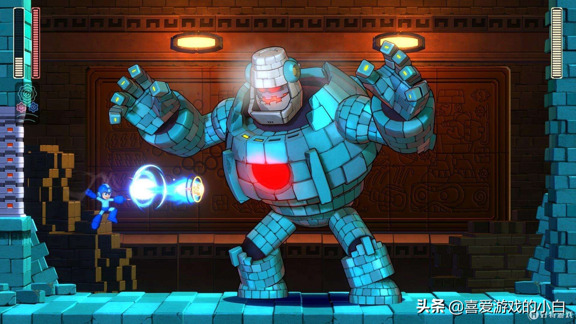 《洛克人11(Megaman 11)》是一款由卡普空制作发行的紧张刺激的横版卷轴动作游戏,但它却为现代的主机平台带来了完全革命性的游戏体验。洛克人系列向来以高难度著称,这代洛克人也不例外,但是作为最新主机版的作品,游戏无论在操作,画质,还是可玩性上都相当的优秀,各种风格迥异的BOSS,以及战胜BOSS后获得的能力,让玩家们大呼过瘾。