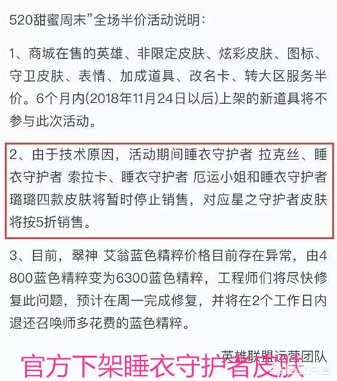 了解到bug之后官方先是关闭了商城的购买渠道,宣布正在维护,没过多久虽然重新打开,但是其中睡衣守护者系列已经不在其中,并且退出此次的半价皮肤活动。由于bug出现的时间非常短,并没有多少玩家享受到这一福利,官方便紧急叫停了活动,虽然事后许多网友不满爆破了官方帖子,但是没能把握住机会错过也没有办法。