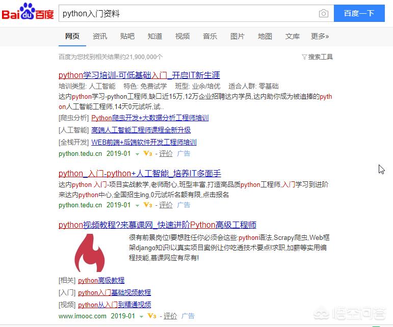 这应该是百度自找的。我在百度找python入门资料,但是第一页以及以下几页都是培训机构的广告。为什么都是广告?因为他们给钱了啊。就是这么赤裸裸,你有什么办法。百度没有竞争对手,可以往死里卖广告。