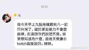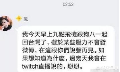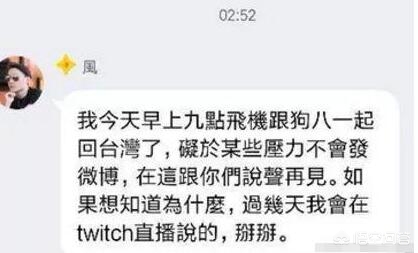 有网友爆出昨天风哥发表的一些言论,表示:自己和分析师狗八一起回台湾了,碍于某些压力不会发微博博所以在群里面说再见。