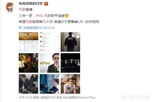 今天我看到了风哥微博删博的时候第一时间觉得是被盗号了。毕竟RNG现在正是上升期也是风头正盛的时候,风哥作为RNG俱乐部的管理层之一不应该有这样的节奏。因为这样的节奏对于现在的RNG是非常不利的。